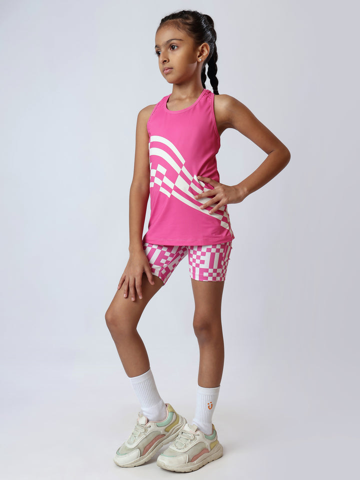 Get your little one ready for fun and movement with this Girls Pink Pixel Checks Tanks and Cycling Shorts Set. Designed for active days outdoors or sports, the soft, breathable fabric keeps her comfortable while the vibrant pixel check pattern adds a playful touch. Perfect for running, jumping, and cycling, this set combines style and ease for every adventure.
